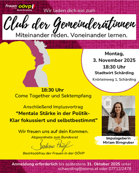 Anmeldung erforderlich bis spätestens 31. Oktober unter schaerding@ooevp.at oder 07712/2478