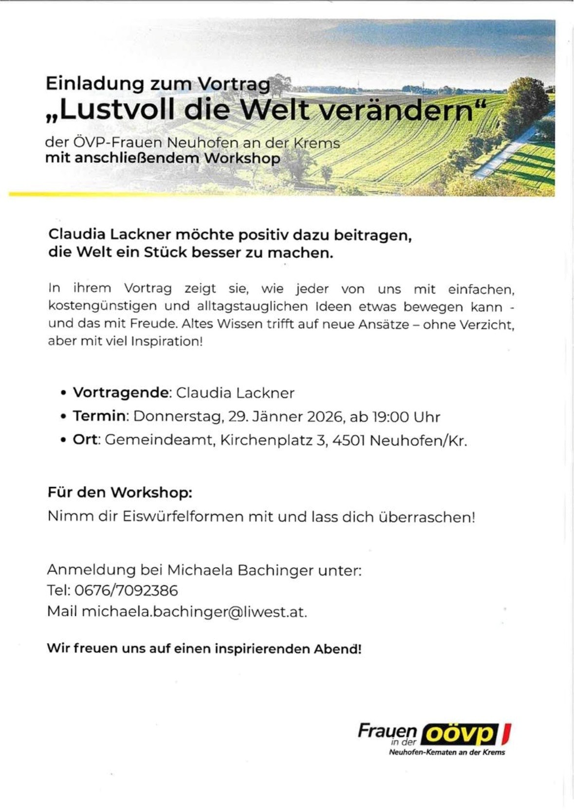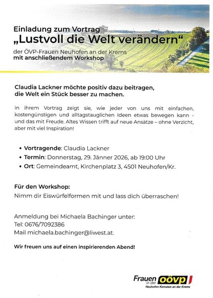 Die Frauen in der OÖVP Neuhofen/Krems laden herzlich zum Vortrag " Lustvoll die Welt verändern" mit anschließendem Workshop mit Claudia Lackner ein.